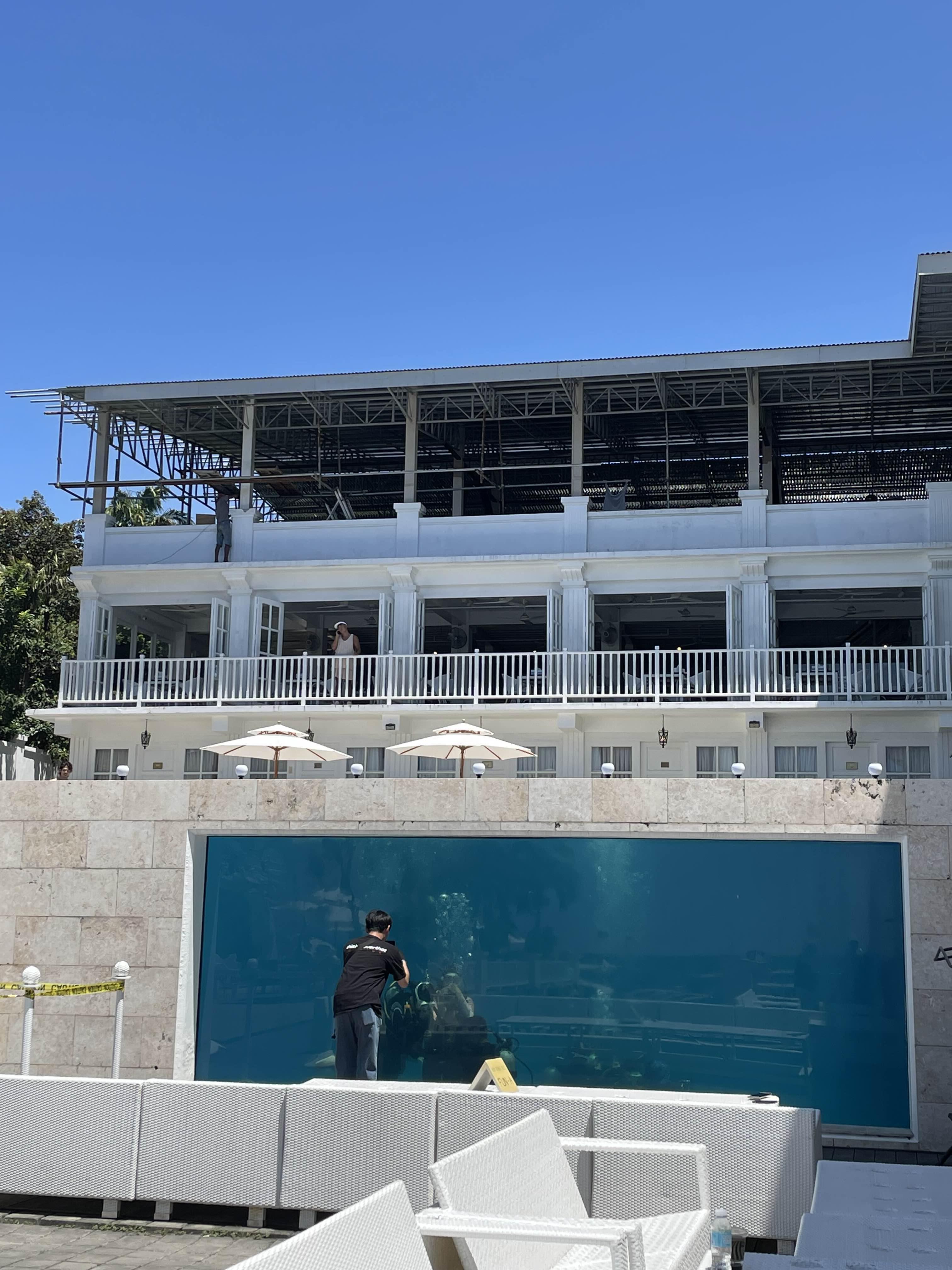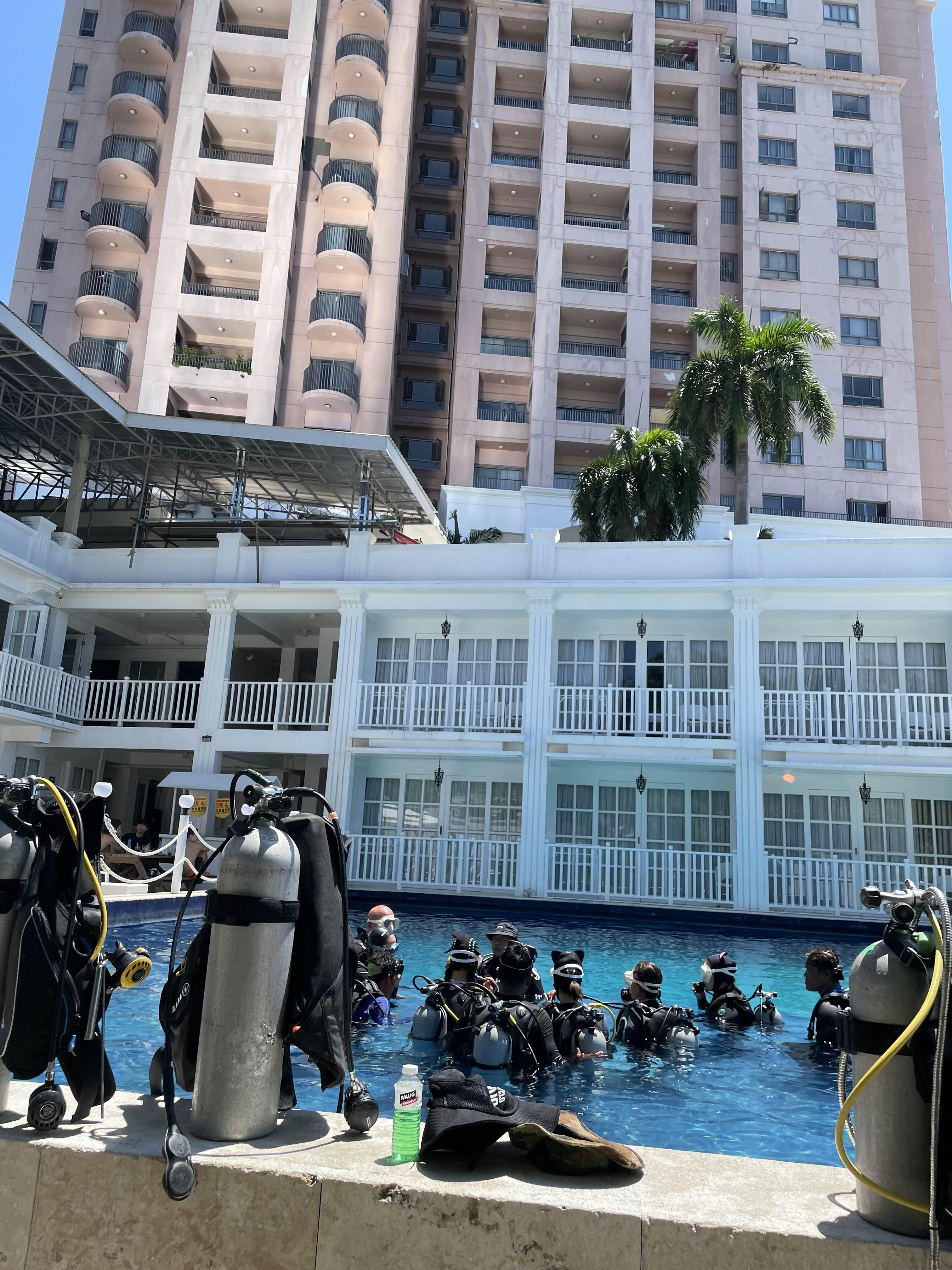 식당 건물 밑에 스쿠버 다이빙 연습하는 곳이 있었어요