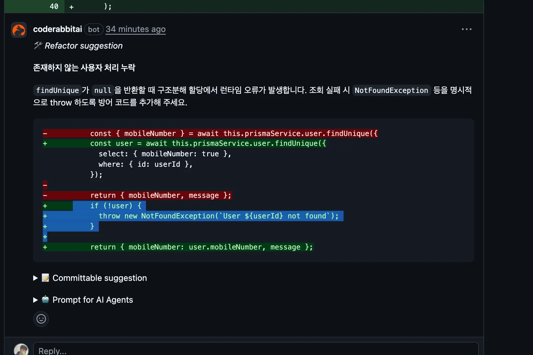 기존 리뷰 챗봇이 주던 단순한 피드백이 아니라 코드 베이스를 기준으로 리뷰해주니까